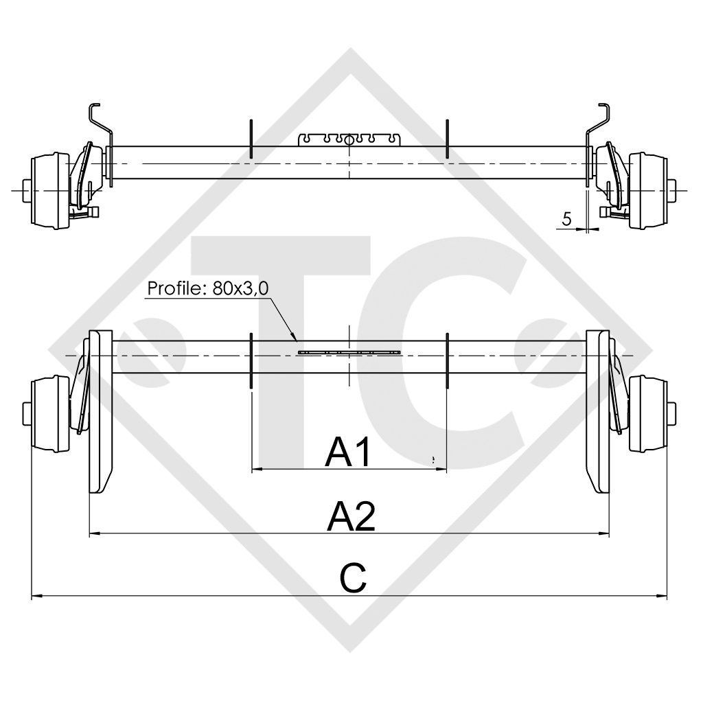 Auflage: Maß A1 480mm, Maß A2 1282mm, Anlage: Maß C 1200mm, Radanschluss 100x4, Radbremse Typ 1637, Einpresstiefe (ET) 27-33mm, Schwinghebelstellung 25°, Achsprofil 80mm, Kegelradschrauben M12x1.5. Lesen Sie mehr...