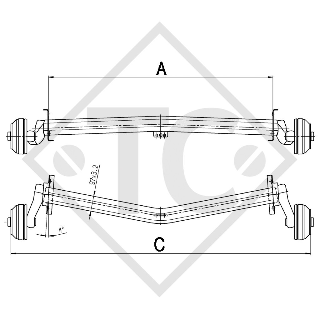 Auflage: Maß A 1550mm, Anlage: Maß C 2080mm, Radanschluss 112x5, Radbremse Typ 2051 Ausf. A, Einpresstiefe (ET) 30mm, Schwinghebelstellung 16°, Achsprofil 97mm, mit AAA (Automatische Nachstellung der Bremsbeläge). Lesen Sie mehr...