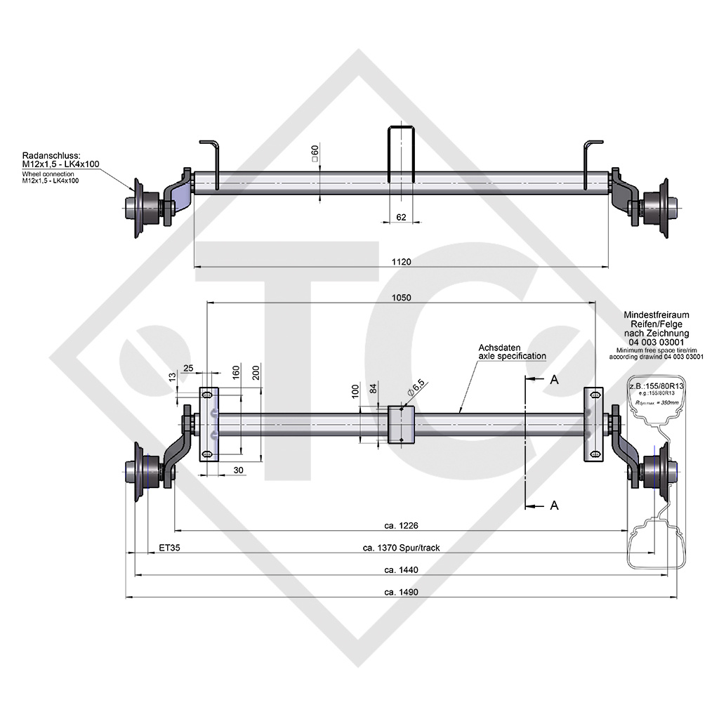 Auflage: Maß A 1050mm, Anlage: Maß C 1440mm, Radanschluss 100x4, Einpresstiefe (ET) 27-45mm, Kegelradschrauben M12x1.5. Lesen Sie mehr...