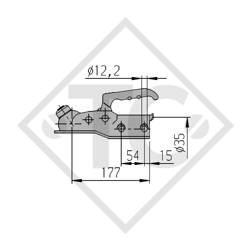 Deichsel ⌀35mm, Bohrungen (Verschraubung) horizontal 12mm, Lochabstand horizontal 54mm, zul. Gesamtgewicht 1600kg, Stützlast 120kg, Material: Stahl. Lesen Sie mehr...