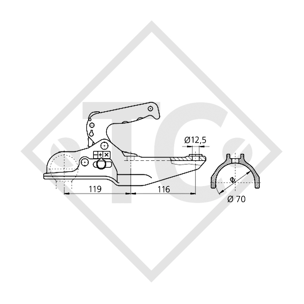 Deichsel ⌀70mm rund, Bohrungen (Verschraubung) vertikal 12.5mm, Lochabstand 116mm, zul. Gesamtgewicht 3000kg, Stützlast 150kg, Material: Temperguss. Lesen Sie mehr...