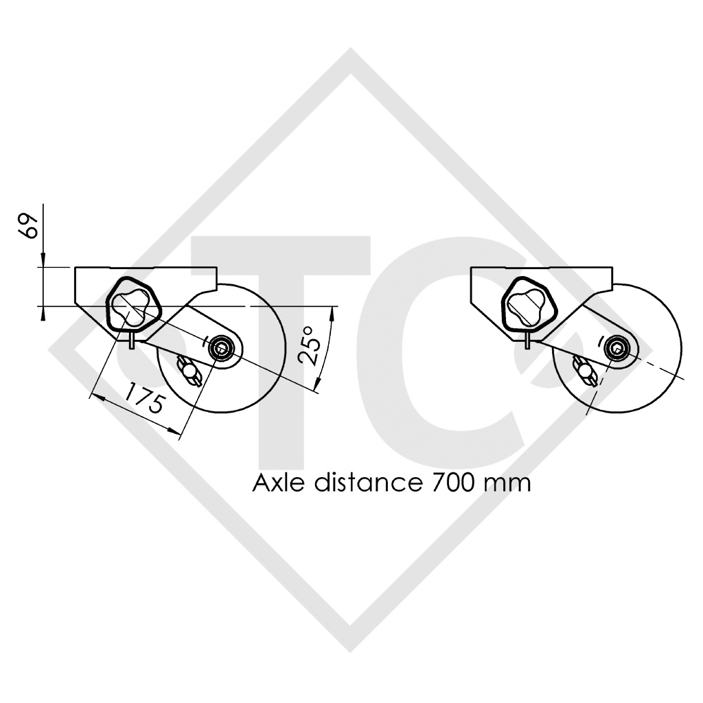 BC: dimension A 1070mm, OHF: dimension C 1500mm, wheel connection 112x5, wheel brake type 2051 vers. A, offset (ET) 30-33mm, swing arm position 25°, axle profile 97mm, ball-head wheel bolts M12x1.5. Read more...