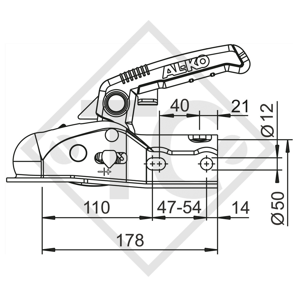drawbar ⌀50mm round, holes (screw connection) horizontal + cross 12mm, hole distance horizontal 47-54mm, cross 40mm, perm. gross weight 1600kg, nose load 120kg, material: steel. Read more...
