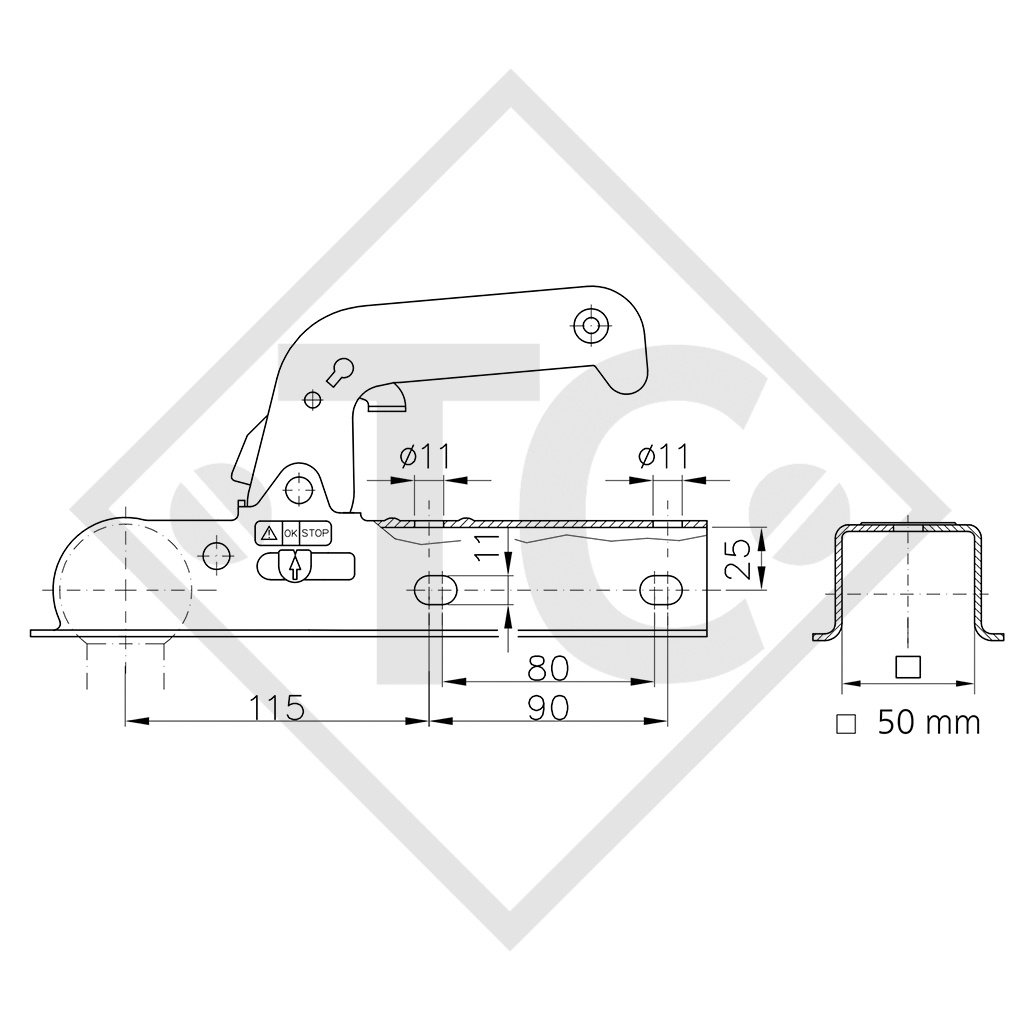 drawbar □ 50mm square, holes (screw connection) cross 11mm, hole distance 80-90mm, perm. gross weight 800kg, nose load 75kg, material: steel. Read more...