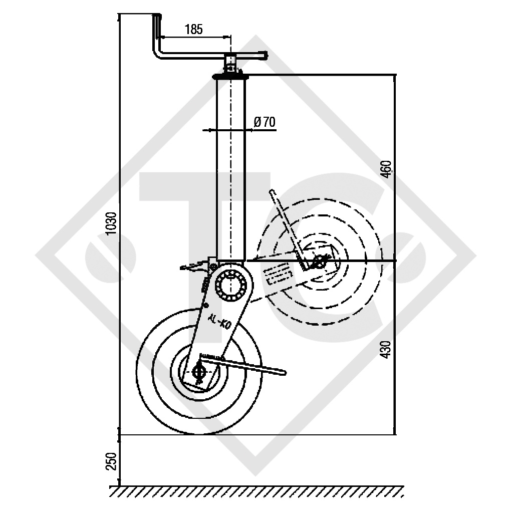 Home / WHEELS, TYRES, RIMS / WHEEL AND TYRE PACKAGE, COMPLETE / WHEEL AND TYRE PACKAGE, COMPLETE, TYRE SIZE 8 INCH / Jockey wheel ø70mm round with support shoe semi-automatic, 1224012, for caravans, car trailers, machines for building industry