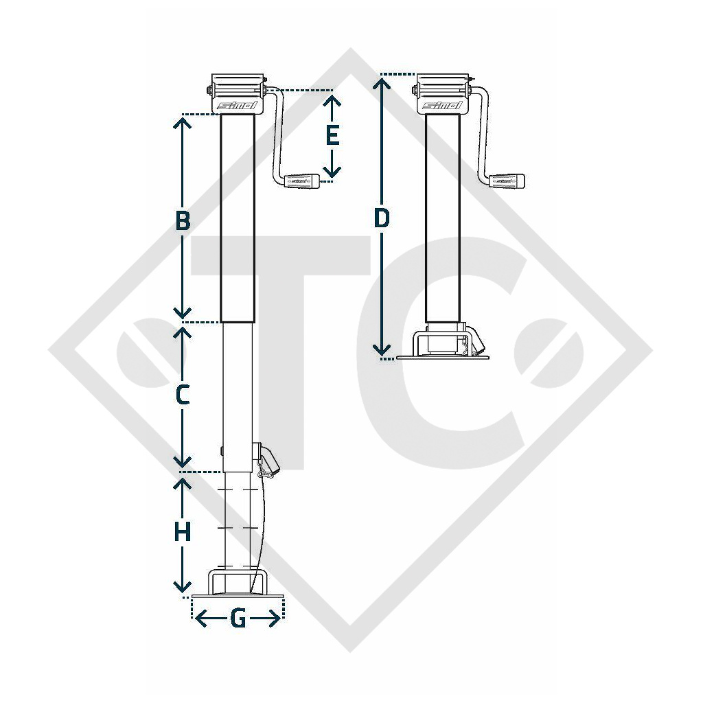Home / CHASSIS PARTS / CHASSIS PARTS SCHLEGL / AXLES / UNBRAKED AXLES & ACCESSORIES / RIGID UNBRAKED AXLE WITH LEAF SUSPENSION / RIGID UNBRAKED AXLE 1500KG / Steday leg □70mm square with side crank, with reduction unit, three-stage, type DG 701/3SF, for agricultural machines and trailers, machines for building industry, implements for road maintenance and snow