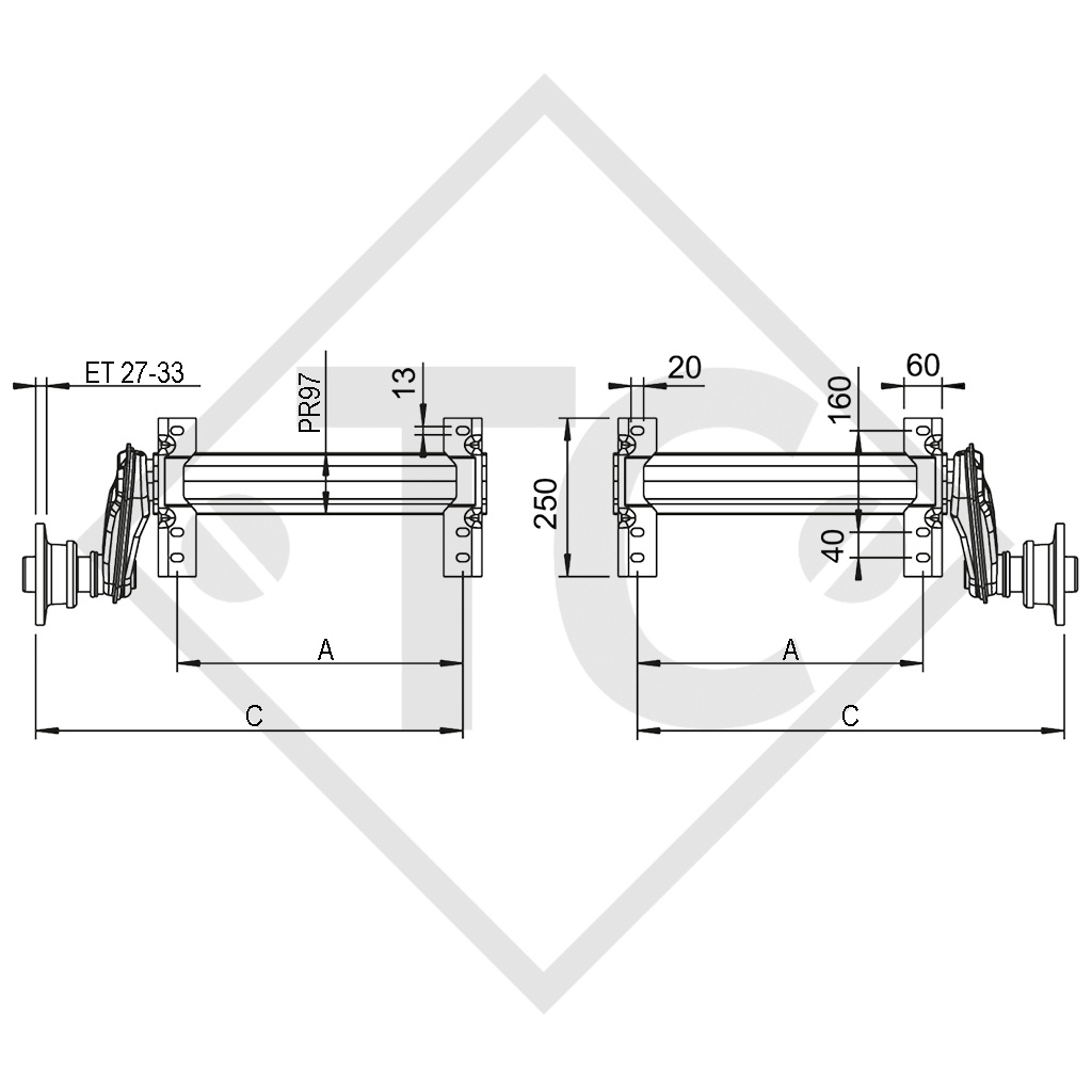 BC: dimension A 450mm, OHF: dimension C 673mm, wheel connection 100x4, offset (ET) 27-33mm, swing arm position 25°, axle profile 97mm, taper-head wheel bolts M12x1.5. Read more...