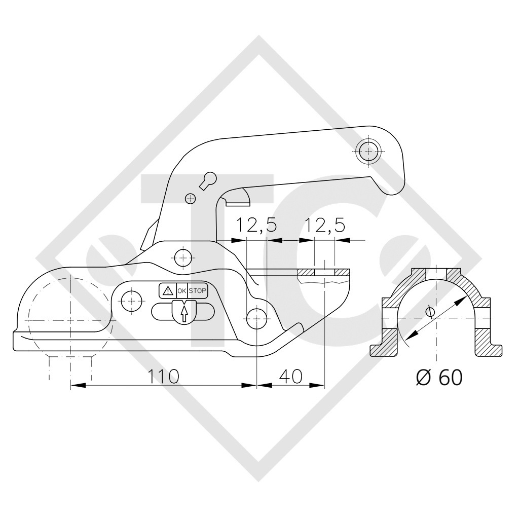 drawbar ⌀60mm round, holes (screw connection) cross 12.5mm, hole distance 40mm, perm. gross weight 3000kg, nose load 150kg, material: malleable cast iron. Read more...