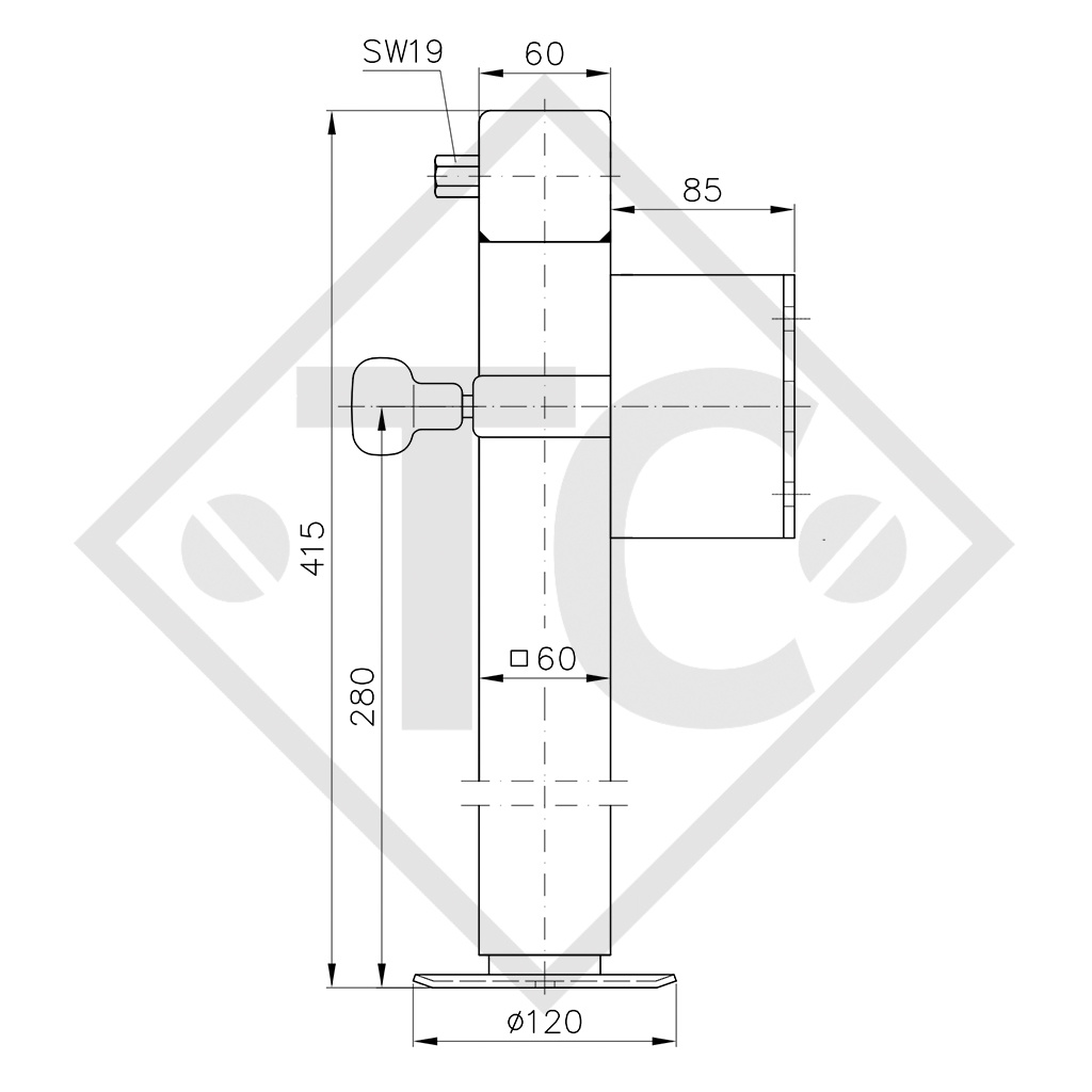Inicio / Marcas / BRADLEY / Apoyo con husillo 60x60mm cuadrado, abatible lateralmente, SF-60-D85-19-280+ADAP, para los remolques convencionales