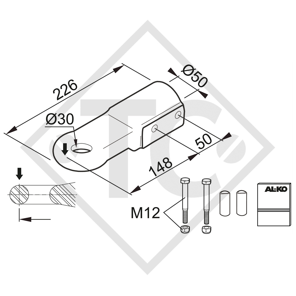 Inicio / CHASIS DE REMOLQUE, PIEZAS / CHASIS DE REMOLQUE, PIEZAS WAP / EJES / EJES CON FRENO & ACCESORIOS / CONJUNTOS EJES TÁNDEM PLUS 1700 A 3500KG, TIPO DE EJE WAGT-B / WADT-L / CONJUNTOS EJES TÁNDEM PLUS 3000KG WAGT-B, TIPO DE EJE WAGT 30 / Argolla E30/A Inglaterra ø30mm versión A montaje exterior, con tornillería