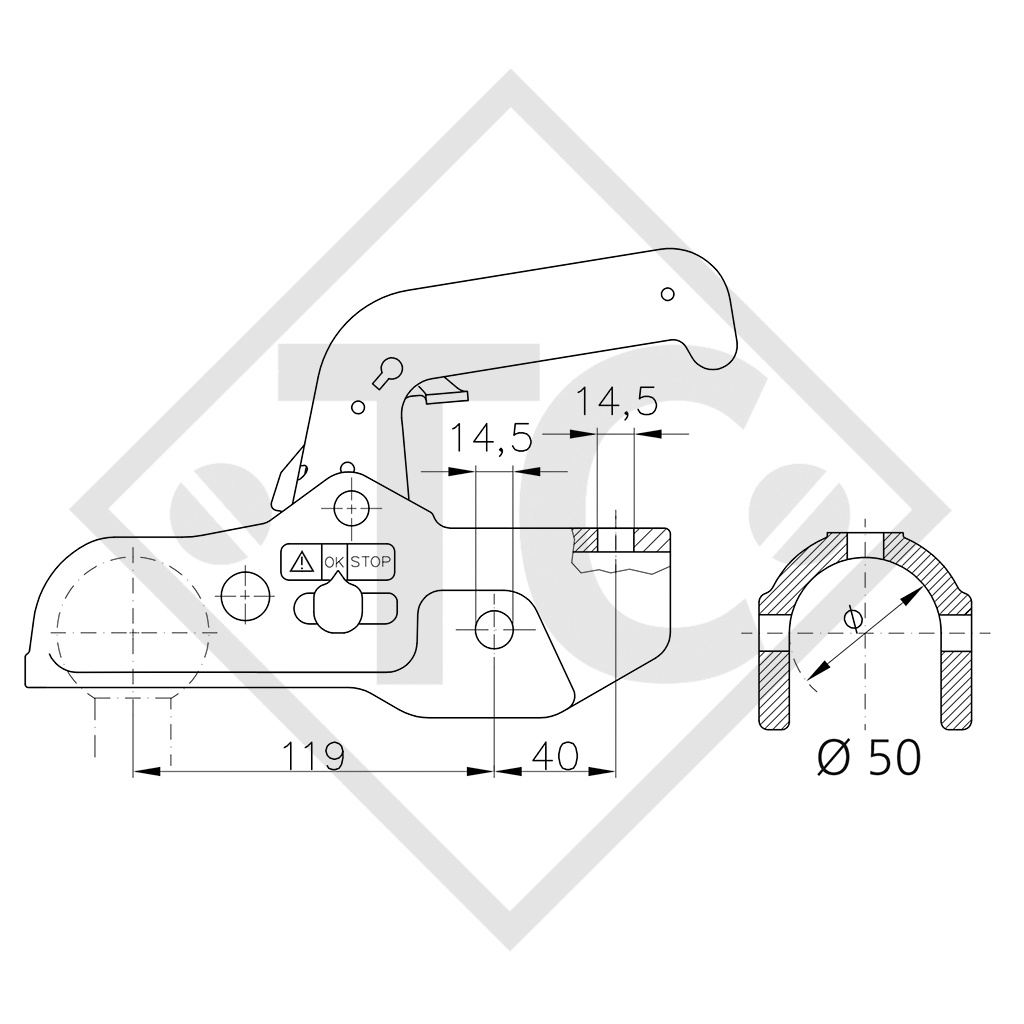 ⌀ lanza 50mm redondo, agujeros (atornillamiento) cruz 14.5mm, distancia entre agujeros 40mm, peso total permitido 3500kg, carga en bola 200kg, material: fyición maleable. Leer más...