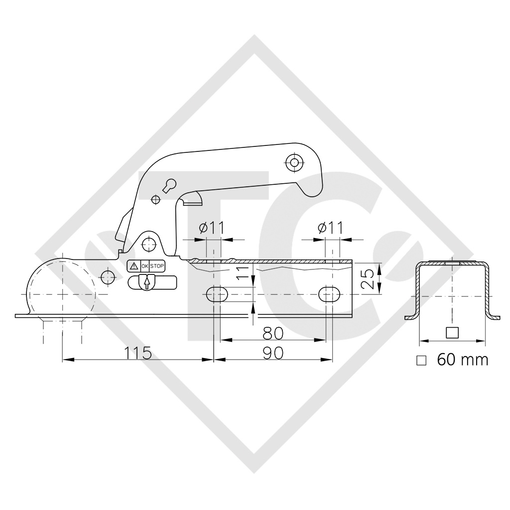 □ lanza 60mm cuadrado, agujeros (atornillamiento) cruz 11mm, distancia entre agujeros 80-90mm, peso total permitido 800kg, carga en bola 75kg, material: acero. Leer más...