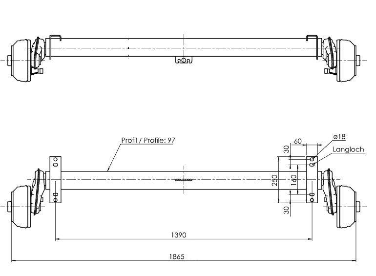 cota A 1390mm, cota C 1865mm, ataque 112x5, tipo de freno de rueda 2051 A, bombeo (ET) 30-33mm, posición del brazo oscilante 25°, perfil de eje 97mm, pernos de rueda cónicos M12x1.5.