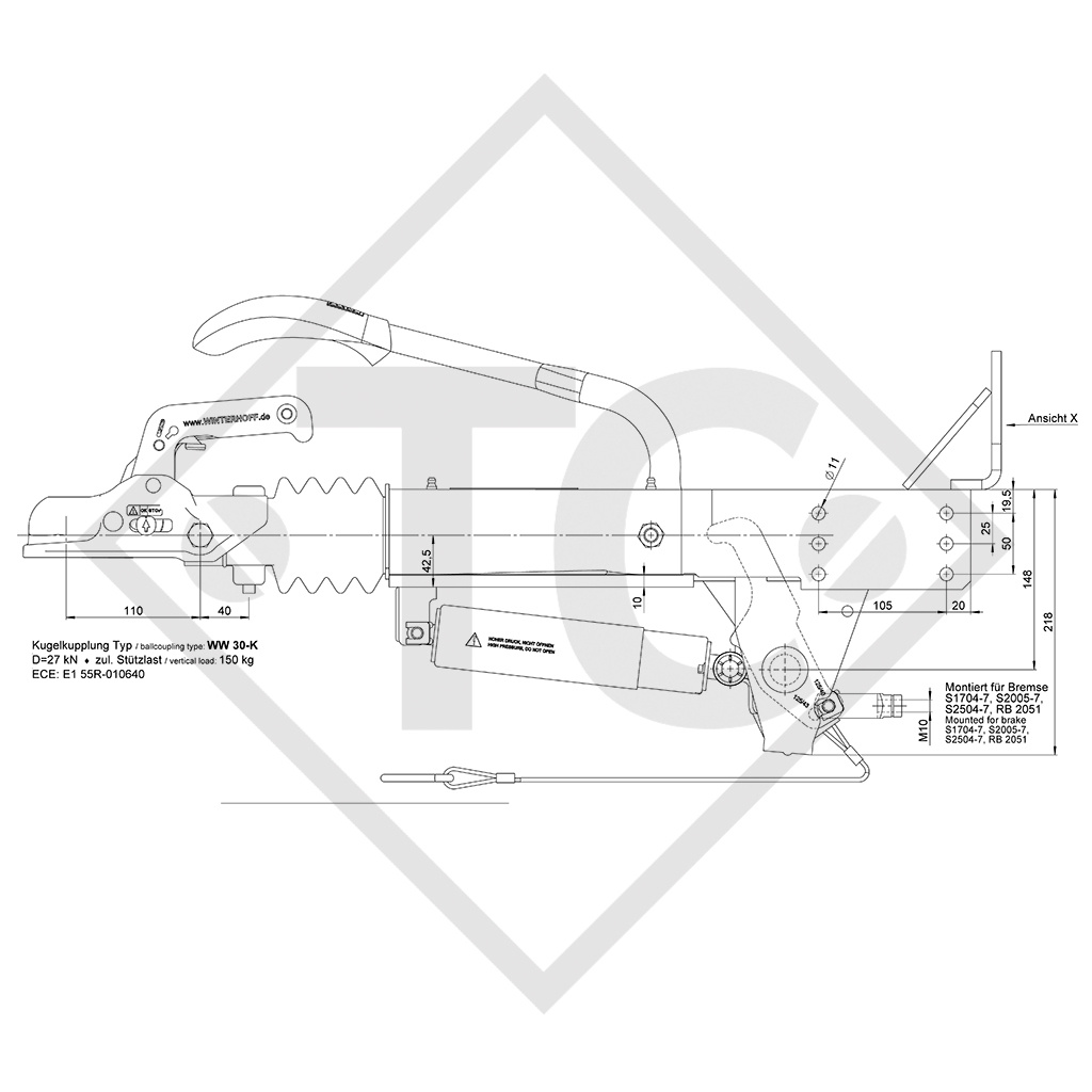conexión 166mm, carga en bola 150kg, versión instalación de lanza de remolque abajo + arriba, combinable con freno de rueda BPW S2005-7, S2504-7 y S3006-7 RASK, con cabezal EM 300 R-B. Leer más...