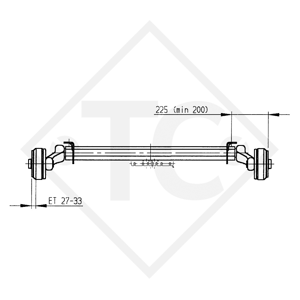 EAB : cote A 1300mm, VOIE : cote C 1780mm, perçage 100x4, type de frein de roue 1637, déport (ET) 27-33mm, position du bras de suspension 25°, corps d'essieu 80mm, vis de roue coniques M12x1.5. Lire plus...