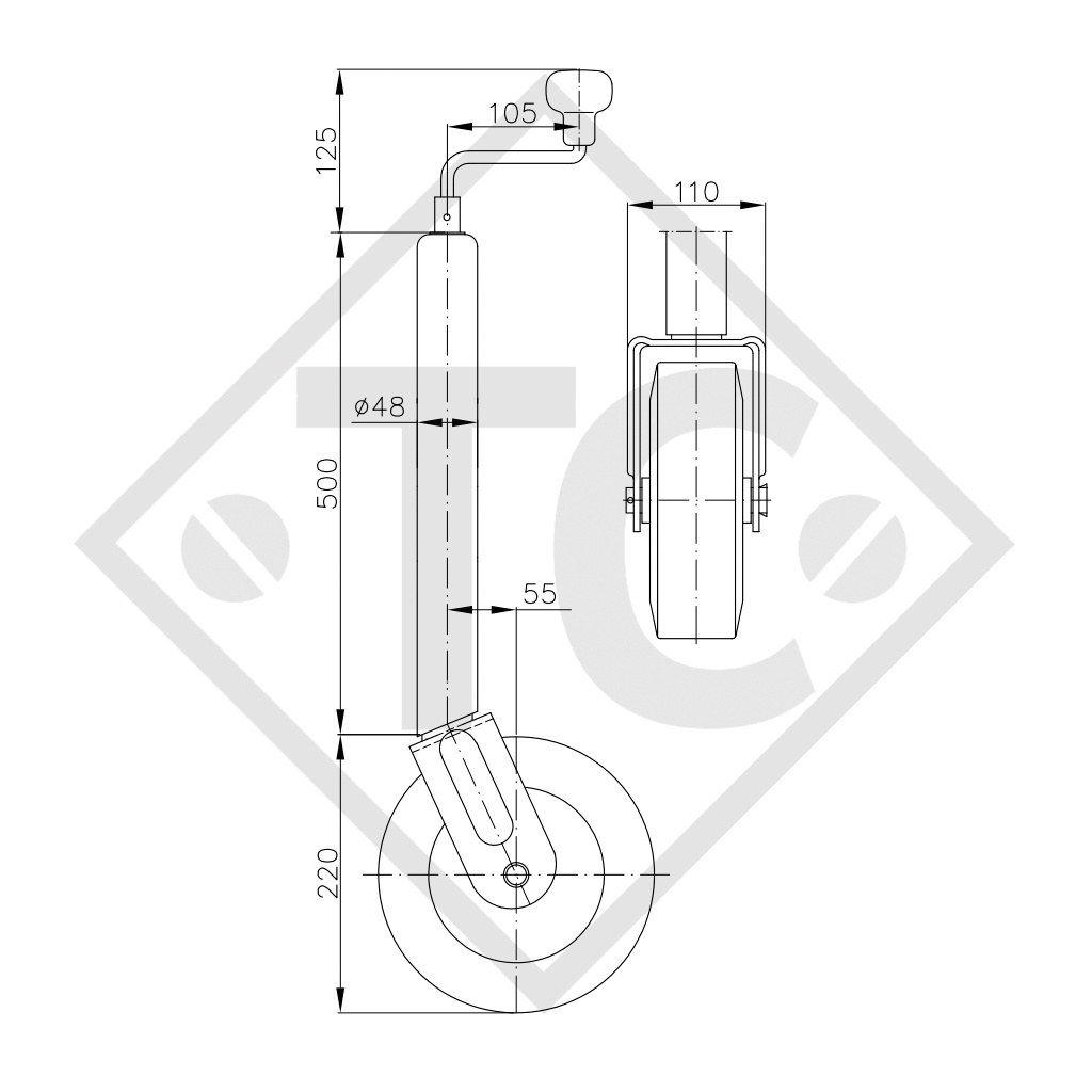 Accueil / Roue jockey ø48mm rond, type ST 48-V-255 SB, pour caravanes, remorques-auto, machines pour l'industrie du bâtiment
