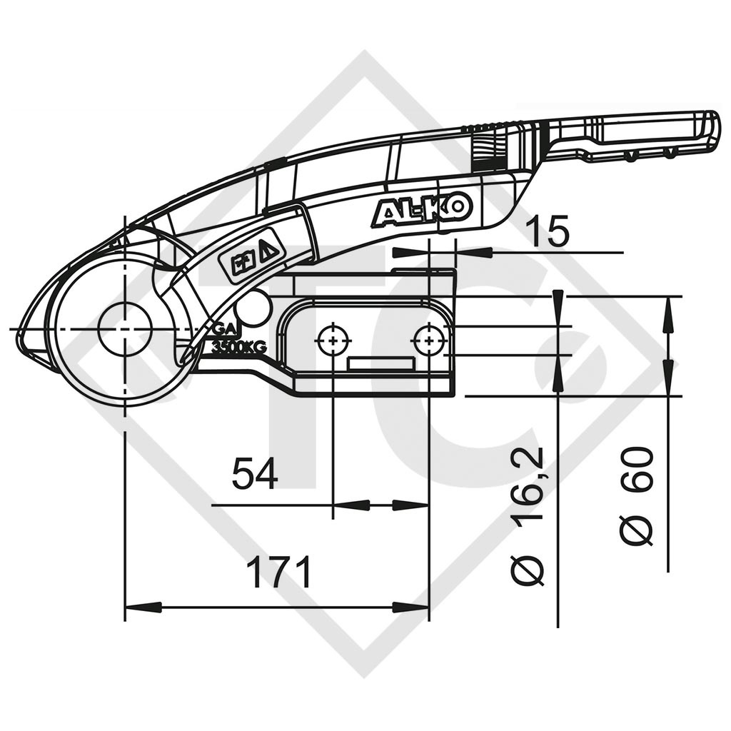 ⌀ de timon 60mm rond, perçages (boulonnage) horizontal 16.2mm, écart trous de ⌀ de timon horizontal 54mm, PTAC maxi 3500kg, charge d'appui 350kg, matériau: fonte. Lire plus...