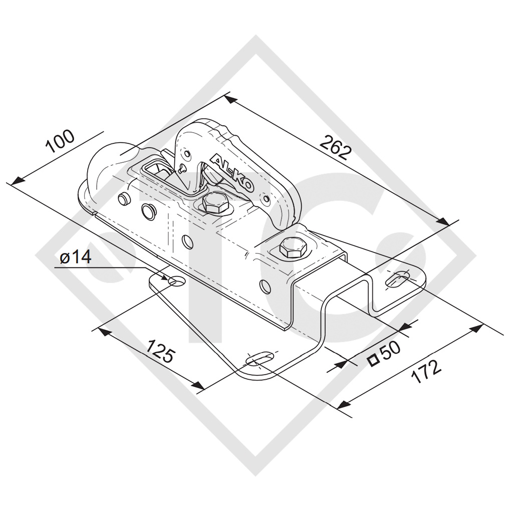 ⌀ de timon 50mm carré avec plaque de montage en V, perçages (boulonnage) verticale 14mm, écart trous de ⌀ de timon 100/125/172mm, PTAC maxi 750kg, charge d'appui 75kg, matériau: acier, avec support de prise. Lire plus...