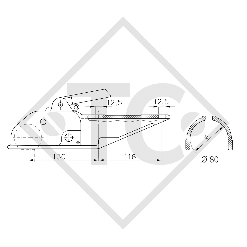 ⌀ de timon 80mm rond, perçages (boulonnage) verticale 12.5mm, écart trous de ⌀ de timon 116mm, PTAC maxi 3000kg, charge à la rougeule 150kg, matériau : fonte malléable. Lire plus...