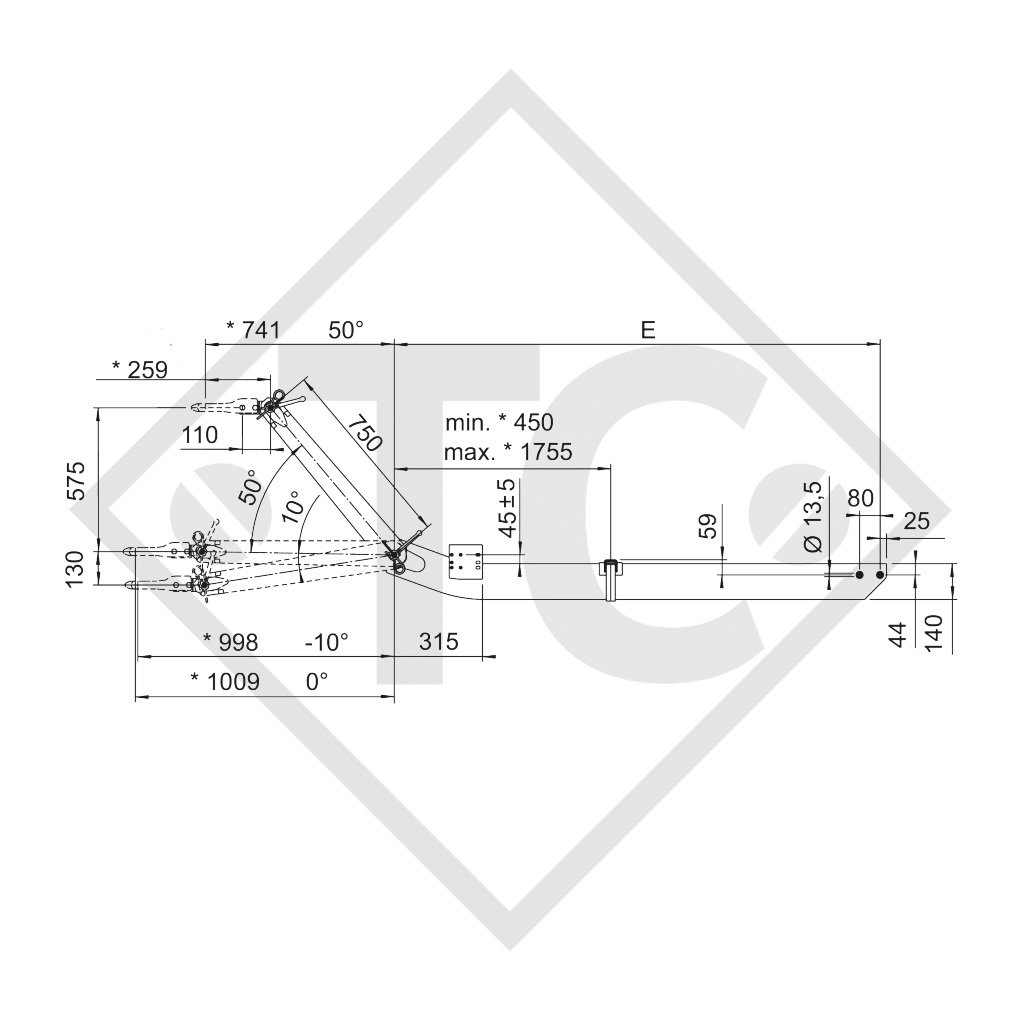 longueur totale K (avec 0°) 2179mm, longueur du timon E 1170mm, profil timon 70x140x3mm, entretoise 750mm, charge à la rotule autorisée 100kg, sans pièces d'accrochage. Lire plus...