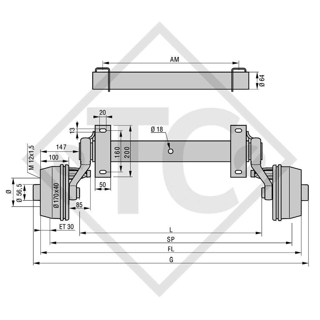 larghezza ai supporti: misura AM 1500mm, larghezza complessiva: misura FL 1930mm, attacco ruota 112x5, freno ruota tipo S 1704-7 RASK, campanatura (ET) 30mm, posizione del braccio oscillante 20°, profilo assale 64mm, colonnette ruote a sfera M12x1.5. Per saperne di più...
