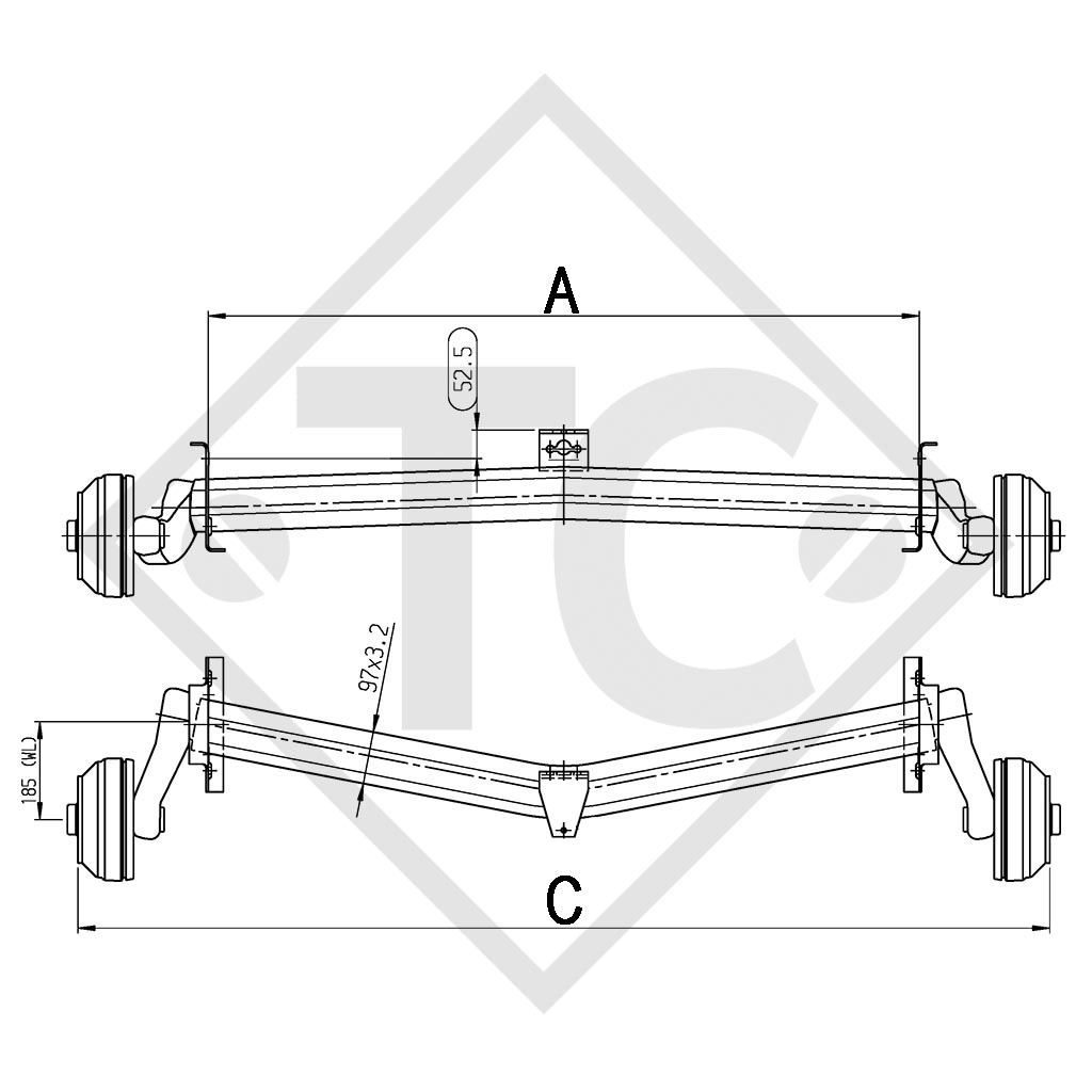 larghezza ai supporti: misura A 1310mm, larghezza complessiva: misura C 1790mm, attacco ruota 100x4, freno ruota tipo 2051 versione A, campanatura (ET) 30mm, posizione del braccio oscillante 16°, profilo assale 97mm, colonnette ruote a cono M12x1.5. Per saperne di più...