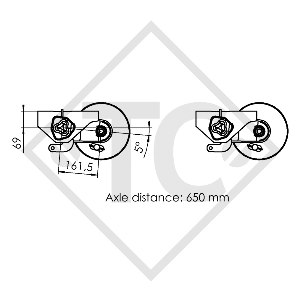 larghezza ai supporti: misura A 1100mm, larghezza complessiva: misura C 1500mm, attacco ruota 112x5, freno ruota tipo 2051 versione Ab, campanatura (ET) 26-30mm, posizione del braccio oscillante 5°, profilo assale 97mm, colonnette ruote a sfera M12x1.5. Per saperne di più...