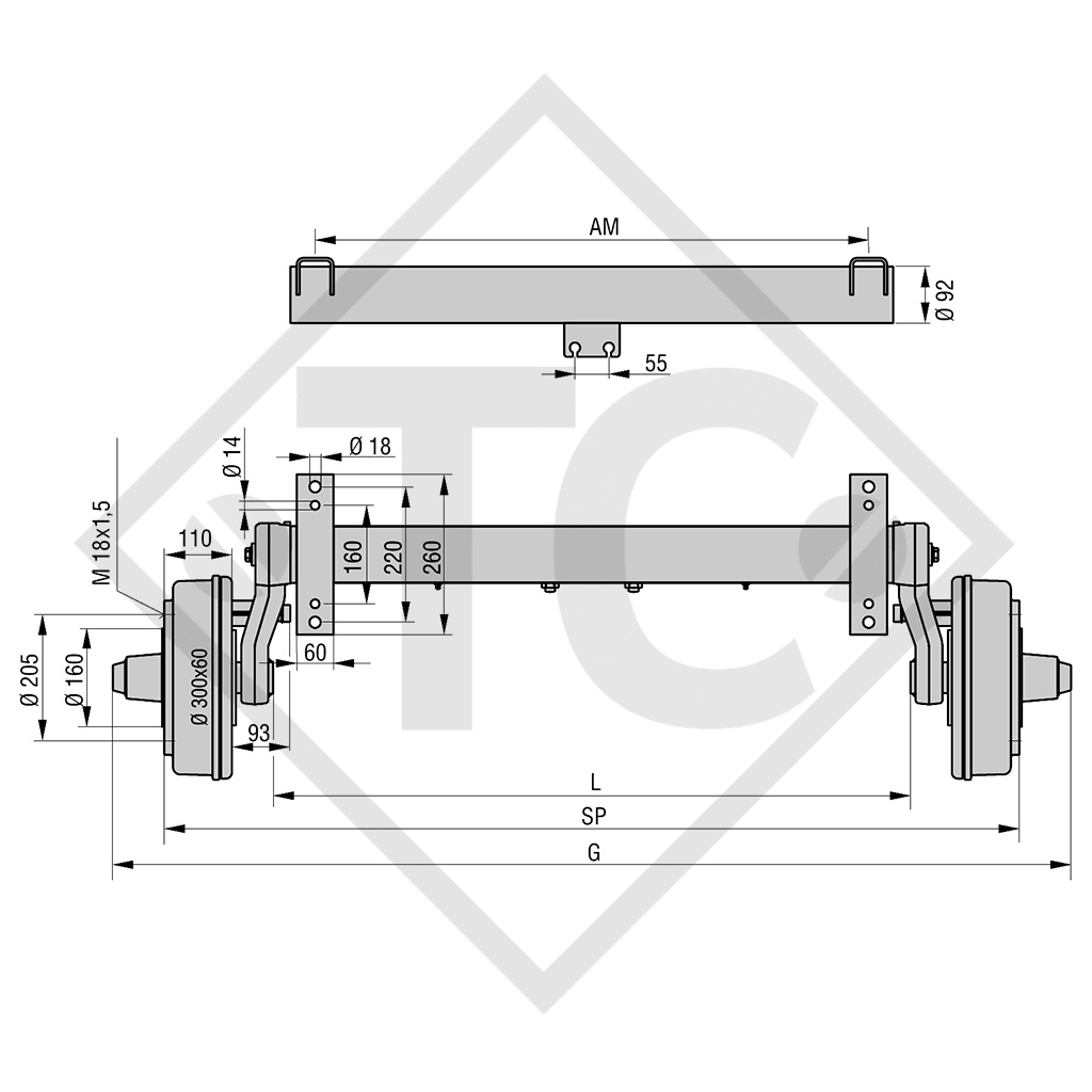 larghezza ai supporti: misura AM 1000mm, larghezza complessiva: misura SP 1500mm, attacco ruota 205x6, freno ruota tipo S 3006-7 RASK, campanatura (ET) 0mm, posizione del braccio oscillante 13°, profilo assale 92mm, colonnette ruote a sfera M18x1.5. Per saperne di più...