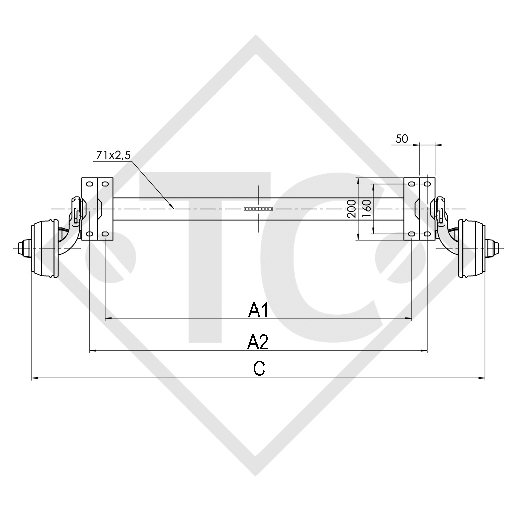 larghezza ai supporti 1: misura A1 980mm, larghezza ai supporti 2: misura A2 1080mm, larghezza complessiva: misura C 1450mm, attacco ruota 98x4, freno ruota tipo 1636G, campanatura (ET) 27-45mm, posizione del braccio oscillante 30°, profilo assale 71mm, c Per saperne di più...