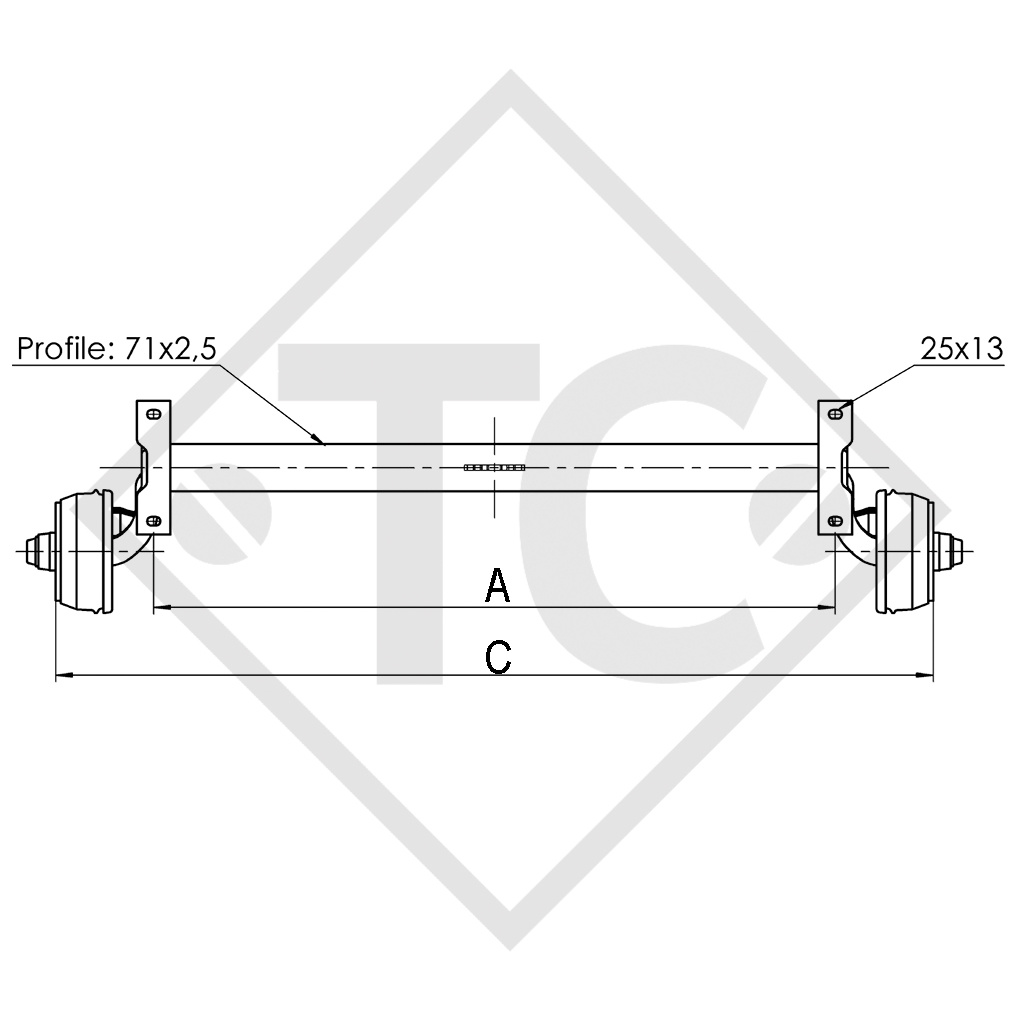 larghezza ai supporti: misura A 1020mm, larghezza complessiva: misura C 1313mm, attacco ruota 100x4, freno ruota tipo 1636G, campanatura (ET) 27-45mm, posizione del braccio oscillante 30°, profilo assale 71mm, colonnette ruote a cono M12x1.5. Per saperne di più...