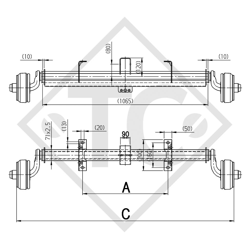 larghezza ai supporti: misura A 1190mm, larghezza complessiva: misura C 1630mm, attacco ruota 98x4, freno ruota tipo 1637, campanatura (ET) 27-45mm, posizione del braccio oscillante 30°, profilo assale 71mm, colonnette ruote a cono M12x1.5. Per saperne di più...