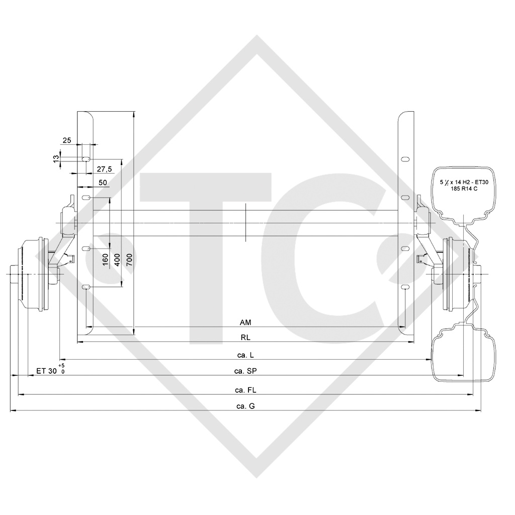 larghezza ai supporti: misura AM 1200mm, larghezza complessiva: misura FL 1625mm, attacco ruota 112x5, freno ruota tipo S 2005-7 RASK, campanatura (ET) 30mm, posizione del braccio oscillante 0°, profilo assale 80mm, colonnette ruote a sfera M12x1.5. Per saperne di più...