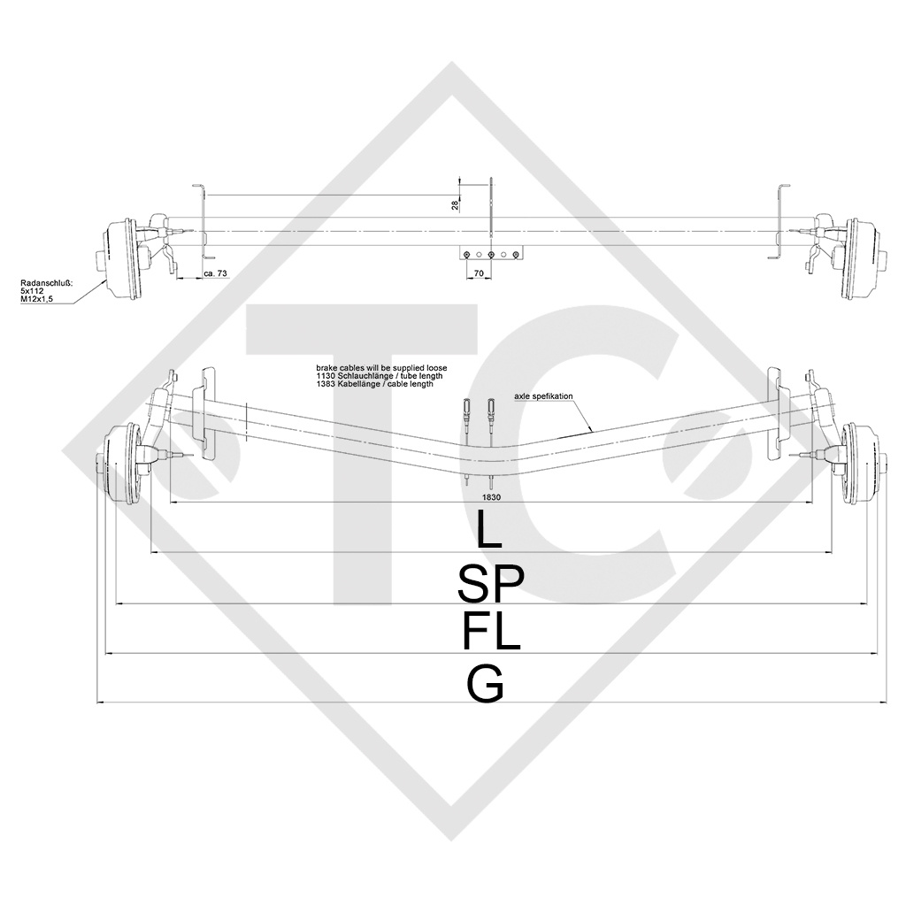 larghezza ai supporti: misura AM 1636mm, larghezza complessiva: misura FL 2200mm, attacco ruota 112x5, freno ruota tipo S 2005-7 RASK, campanatura (ET) 30mm, posizione del braccio oscillante 25°, profilo assale 95mm. Per saperne di più...