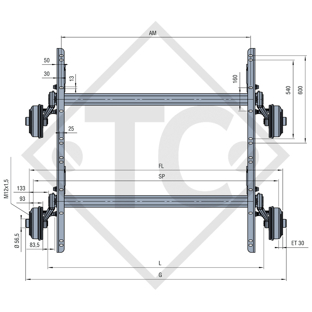 larghezza ai supporti: misura AM 1200mm, larghezza complessiva: misura FL 1740mm, attacco ruota 112x5, freno ruota tipo S 2005-7 RASK, campanatura (ET) 30mm, posizione del braccio oscillante 20°, profilo assale 80mm, colonnette ruote a cono M12x1.5. Per saperne di più...
