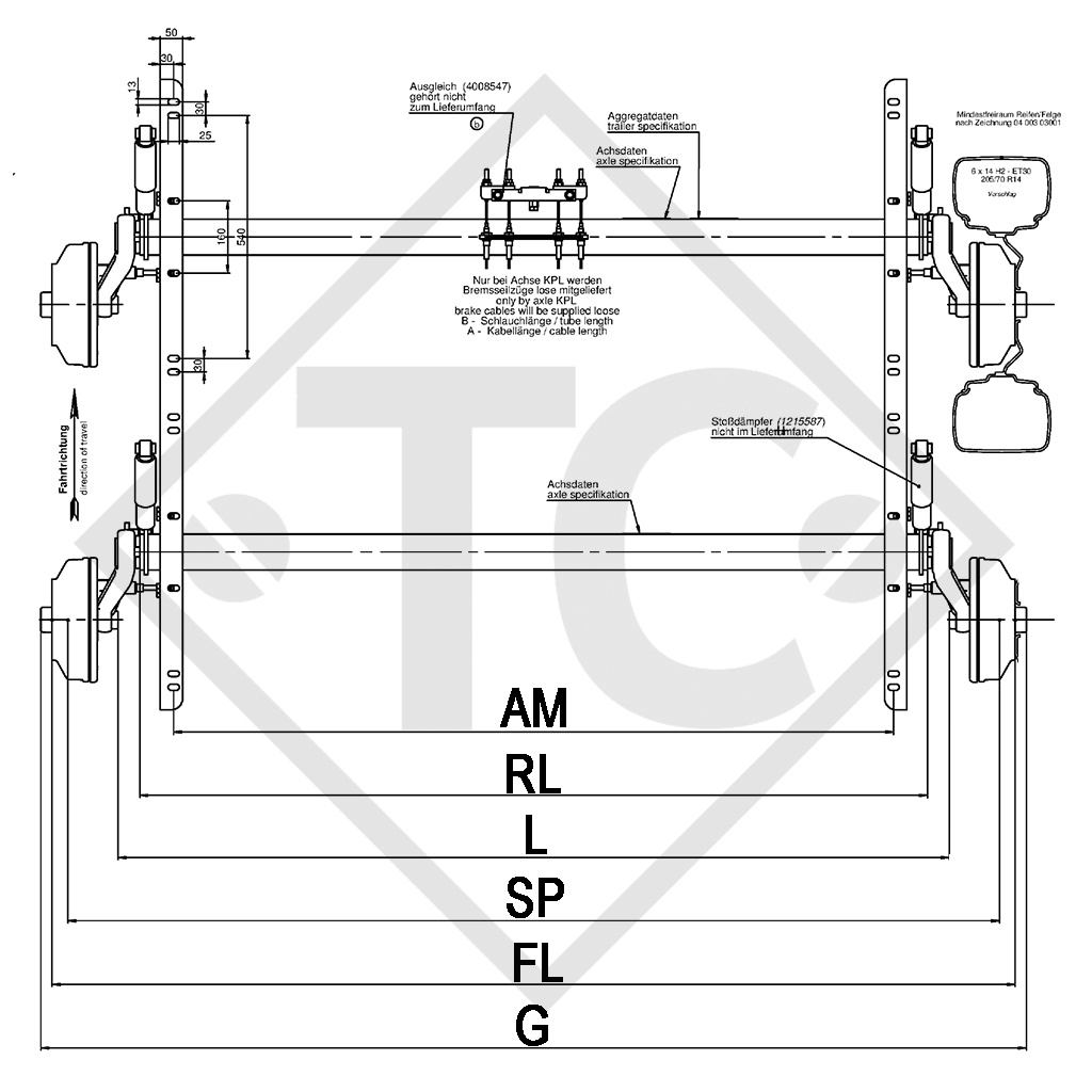 larghezza ai supporti: misura AM 1100mm, larghezza complessiva: misura FL 1640mm, attacco ruota 112x5, freno ruota tipo S 2504-7 RASK, campanatura (ET) 30mm, posizione del braccio oscillante 20°, profilo assale 80mm. Per saperne di più...