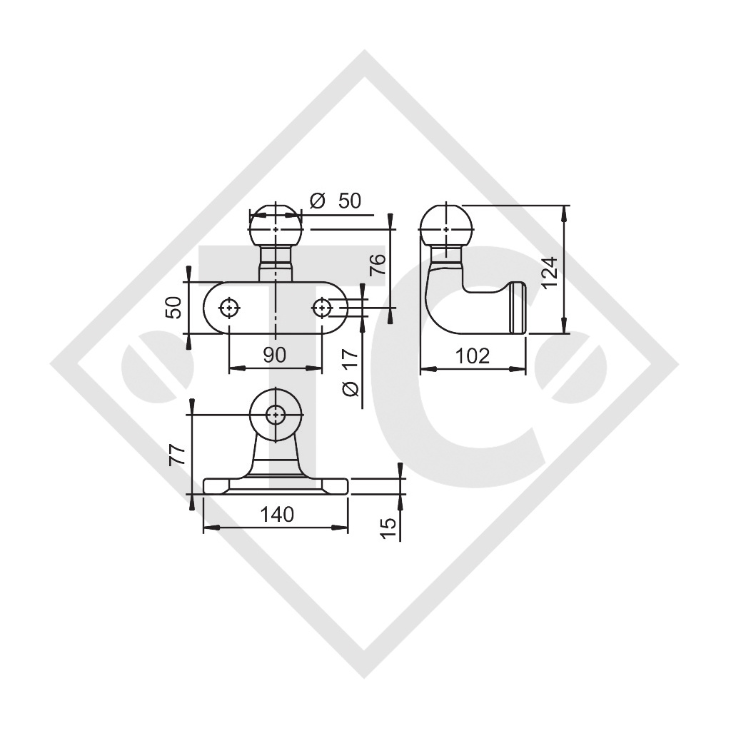 schema di foratura 90mm, 2 fori Ø17mm, carico rimorchio ammesso max. 2000kg, carico d’appoggio 150kg, Valore D/Dc 17.0 kN, n. approvazione ECE E13 55R-01 4042, Anwendungsbereich Geländewagen, Kleintransporter. Achtung: Für AKS geeignet