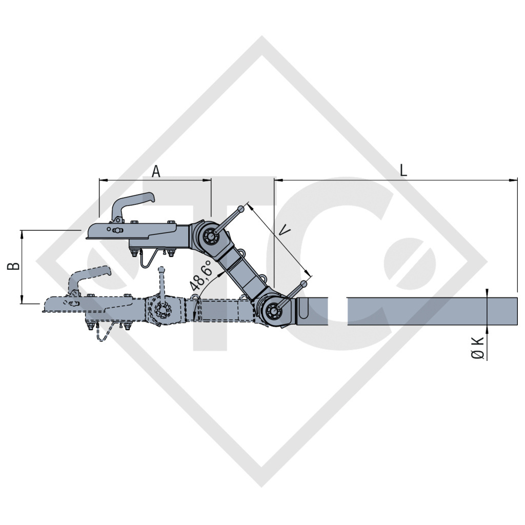 lunghezza timone L 1575mm, timone K 70mm, con occhione DIN misura A 655mm, altezza B 0-375mm, distanziatore V 500mm, carico d'appoggio cons. 75kg. Per saperne di più...